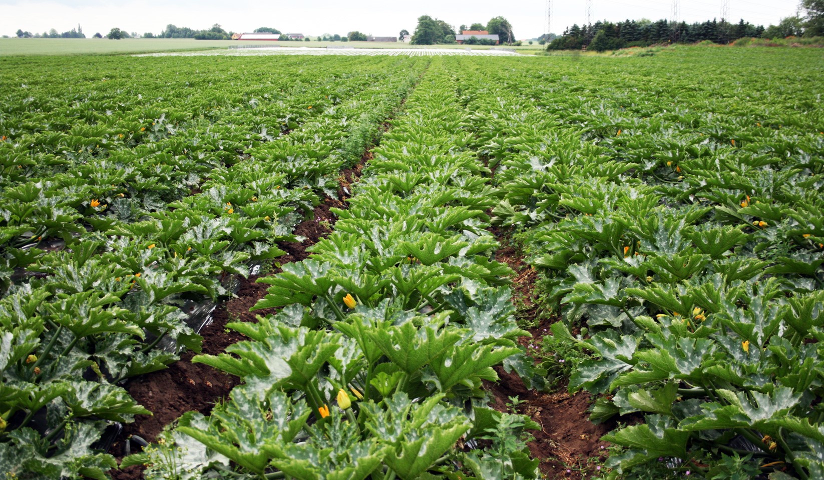 Zucchiniplantan växer lågt och kräver mycket sol och värme för att utveckla fina frukter. Vi odlar på friland på upplagda jordbäddar.